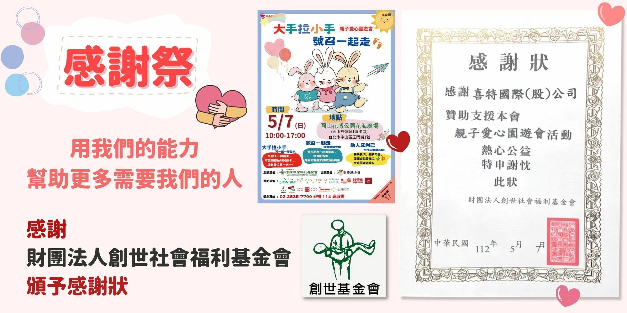 感謝【財團法人創世社會福利基金會】頒予感謝狀,很榮幸能夠參予"親子愛心園遊會"為社會愛心盡一份心意,我們用溫暖的愛散播到世界的每一個角落,讓Caring台灣親子好物不再只是守護寶寶和媽咪,而是讓這份愛溫暖全世界。